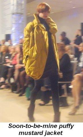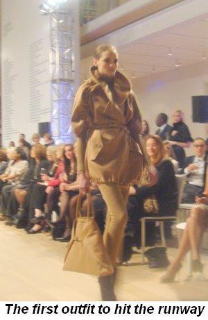 tights will be back again, a puffy coat in a beautiful mustard color, military type jackets in olive, sparkly paillettes peeking out from unexpected places (a sleeve or a neckline), a beautiful jersey evening gown in chocolate and black, a feathered mustard tank with metallic leather jeans…oh the looks were amazing! The handbags were gorgeous too and came in a triangular shape as well as a puffy evening bag style. I loved every piece! The room was filled with over 300 fashionistas including Linda Johnson Rice, Robin Berger, Patricia Cox, Sheridan