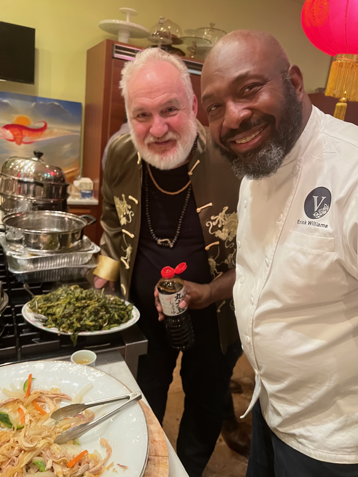 dumplings two ways); Chef Sarah Stegner (spring rolls and spicy mushrooms with shrimp); Chef Tigist Reda (whole fish); Chef Joe Flamm (longevity noodles); Chef Erick Williams (sui mai and garlic broccoli); Chef Brian Jupiter (rice cakes with crawfish and pickled shrimp); Chef Carol Cheung (Peking duck, jellyfish salad and Chinese egg tarts); Chef Hector Guerrero (Chinese BBQ ribs) and Tea Purveyor Annie Xiang (dragon well green tea and big red robe Wulong tea). Mai tais were served by Jade