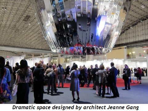trays and caviar topped hors d'oeuvres were passed through the well-heeled throng. Designed by Peter Marino, the space is a work of art–all black, white and silver sleekness with a restroom that belongs in the Louvre, pink slabs of marble on all four walls